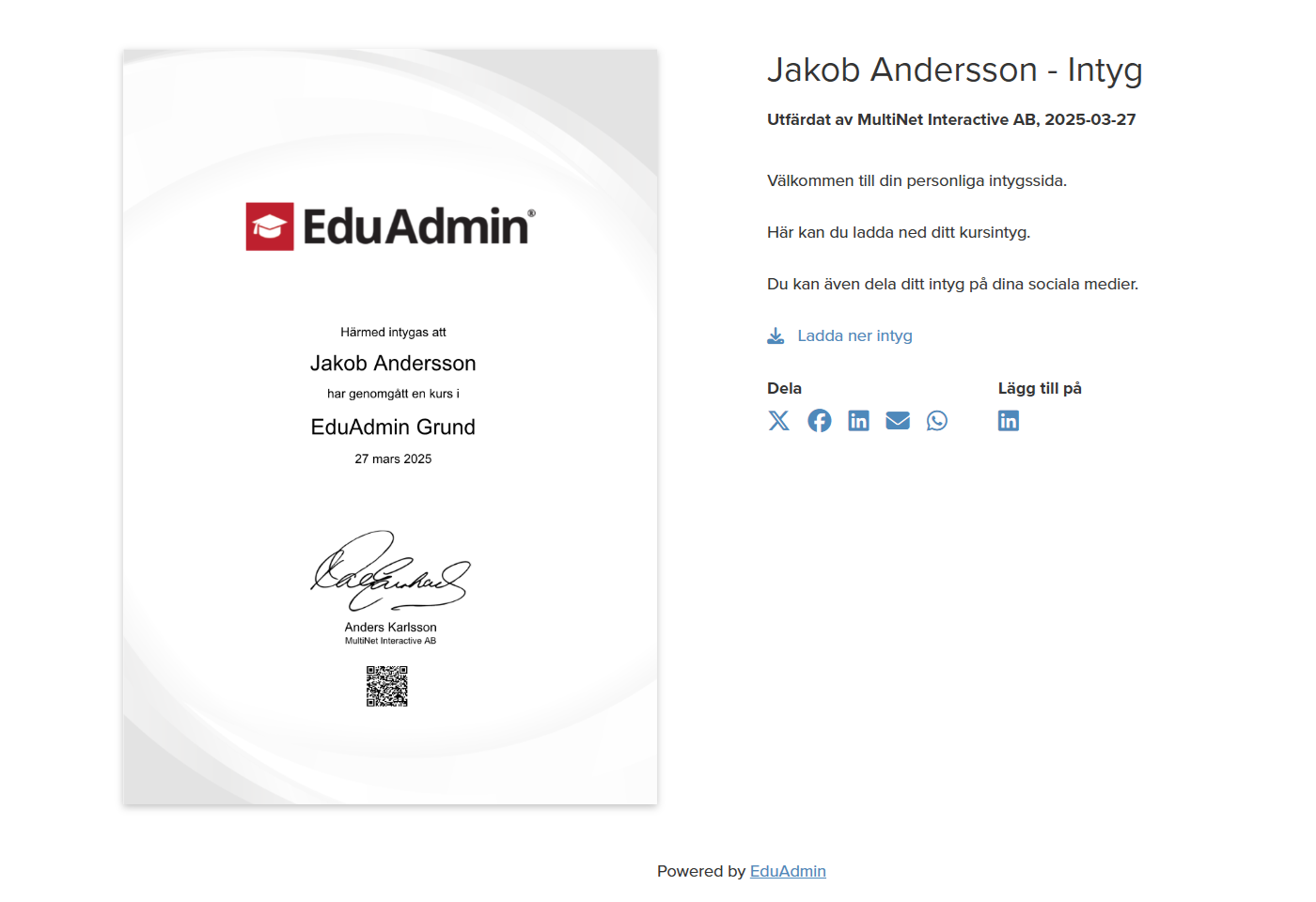 Med EduAdmin lager du enkelt skreddersydde digitale kursbevis som kan verifiseres online. Når en deltaker har fullført et kurs, genererer systemet automatisk et profesjonelt bevis som kan lastes ned eller deles digitalt.